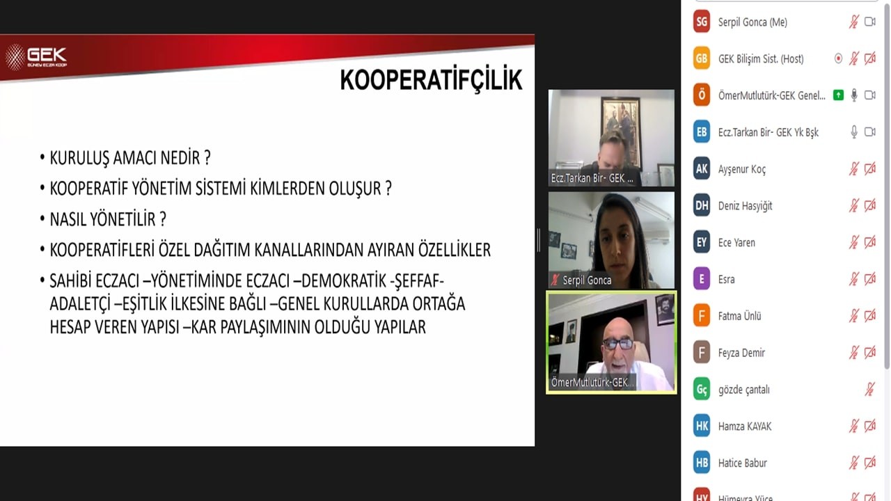 Güney Ecza Kooperatifi 01/06/2021 tarihinde 5. Sınıf öğrencileri ile “Eczane Dağıtım Kanalı İlişkileri ve Kooperatifçilik’’ konulu çevrimiçi toplantıda bir araya geldi. Toplantı Eczacılık Fakültesi Dekanı Prof. Dr. Necmiye CANACANKATAN, Dekan Yardımcıları, Prof. Dr. Seyhan ŞAHAN FIRAT ve Dr. Öğretim Üyesi Zuhal UÇKUN ŞAHİNOĞULLARI, 5. Sınıf danışmanı Dr. Öğr. Üyesi Serpil GONCA ve Eczacılık 5. Sınıf öğrencileri ile GEK Yönetim Kurulu Başkanı Ecz. Tarkan BİR ve GEK Genel Müdürü Ömer MUTLUTÜRK’ün katılımı ile gerçekleşti. Ecz. Tarkan BİR ve Ömer MUTLUTÜRK tarafından 5. Sınıf öğrencilerine GEK’in eczane açarken sağlamış olduğu destekler ve ayrıca Kooperatifçiliğin tanımı, kuruluş amacı ve kooperatifçiliğin özel dağıtım kanalları ile farklı yönleri ile ilgili olarak genel bilgiler verildi.