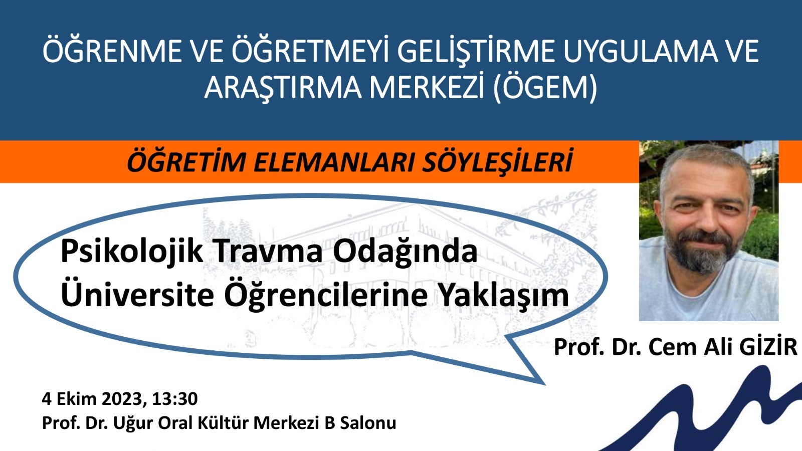 Öğrenme ve Öğretmeyi Geliştirme Uygulama ve Araştırma Merkezi (ÖGEM) tarafından “Öğretim Elemanları Söyleşileri” kapsamında 4 Ekim 2023 tarihinde üniversitemiz öğretim elemanlarına yönelik “Psikolojik Travma Odağında Üniversite Öğrencilerine Yaklaşım” isimli söyleşi gerçekleştirdi. Üniversitemiz Prof. Dr. Uğur Oral Kültür Merkezi B Salonu’nda gerçekleşen söyleşiye, farklı alanlarda çalışan birçok öğretim elemanı katılım sağladı. Eğitim Fakültesi Eğitim Bilimleri Bölümü Rehberlik ve Psikolojik Danışmanlık Anabilim Dalı öğretim üyesi Prof. Dr. Cem Ali GİZİR’in sunumuyla gerçekleşen söyleşide travmatik yaşam olayları sonrası psikolojik travma tepkileri gösteren öğrencilere nasıl yaklaşılması gerektiği bilgisi paylaşıldı. Bu bakış açısıyla, psikolojik travma ile ilgili kısa bilgiler sunularak, öğretim elemanlarının öğrencileriyle etkileşimlerinde dikkate alabilecekleri konular ele alındı. Bu öneriler doğrultusunda öğretim elemanlarına, psikolojik travma odağındaki öğrencileriyle sağlıklı bir etkileşim kurabilmeleri ve psikolojik travma yaşayan öğrencilerine destek olabilmeleri konusunda bilgilendirmeler yapıldı. Söyleşinin ardından gerçekleşen soru-cevap bölümünden sonra Rektör Danışmanımız Prof. Dr. Tuğba YELKEN’in, Prof. Dr. Cem Ali GİZİR’e teşekkür belgesi takdimi ile söyleşi sonlandırıldı.