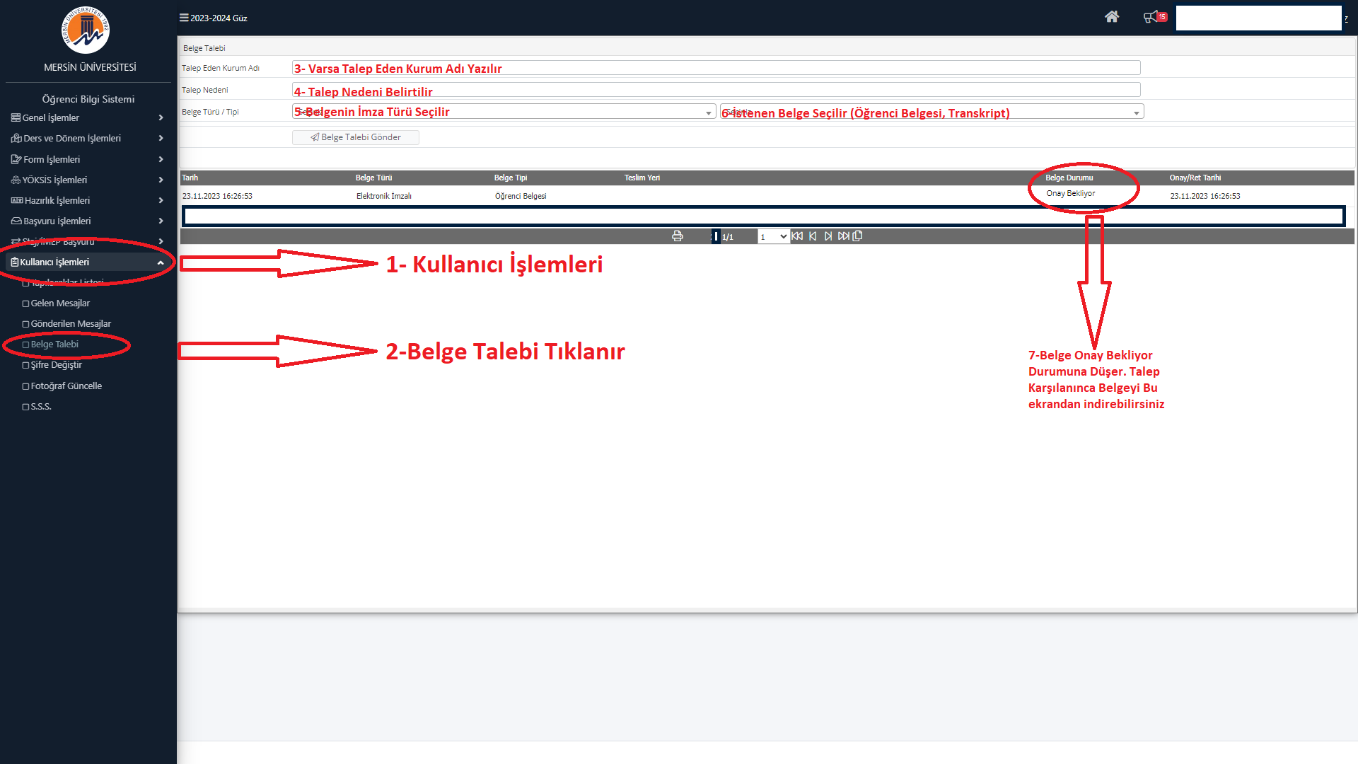 1-Öğrenci, öğrenci belgesi ve başarı takip belgesi ile ilgili talebini Öğrenci Bilgi Sistemi (ÖBS)-> Kullanıcı İşlemleri-> Belge Talebi panelinden yapabileceklerdir.