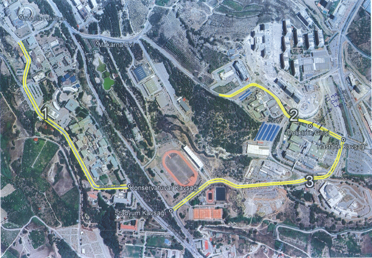 Resimde belirtilen 1 Nolu hat üzerinde (Konservatuvar Kavşağı ile Mimarlık Kavşağı arasındaki her iki yönde) park yasağının Rektörlükçe otopark alanları oluşturulması sonrasında başlatılmasına, 2 Nolu hat üzerinde (Hastane Kavşağı, Poliklinik Girişi ve Diş Hekimliği Fakültesi arasındaki her iki yönde) Poliklinik giriş bölgesinde trafik levha ve işaretleri belirlenmiş 12 araçlık engelli otoparkı mevcut ve 3 Nolu hat üzerinde (Hastane Kavşağı ile Stadyum kavşağı arasındaki her iki yönde ) park yasağının başlatılmasına karar verilmiştir.