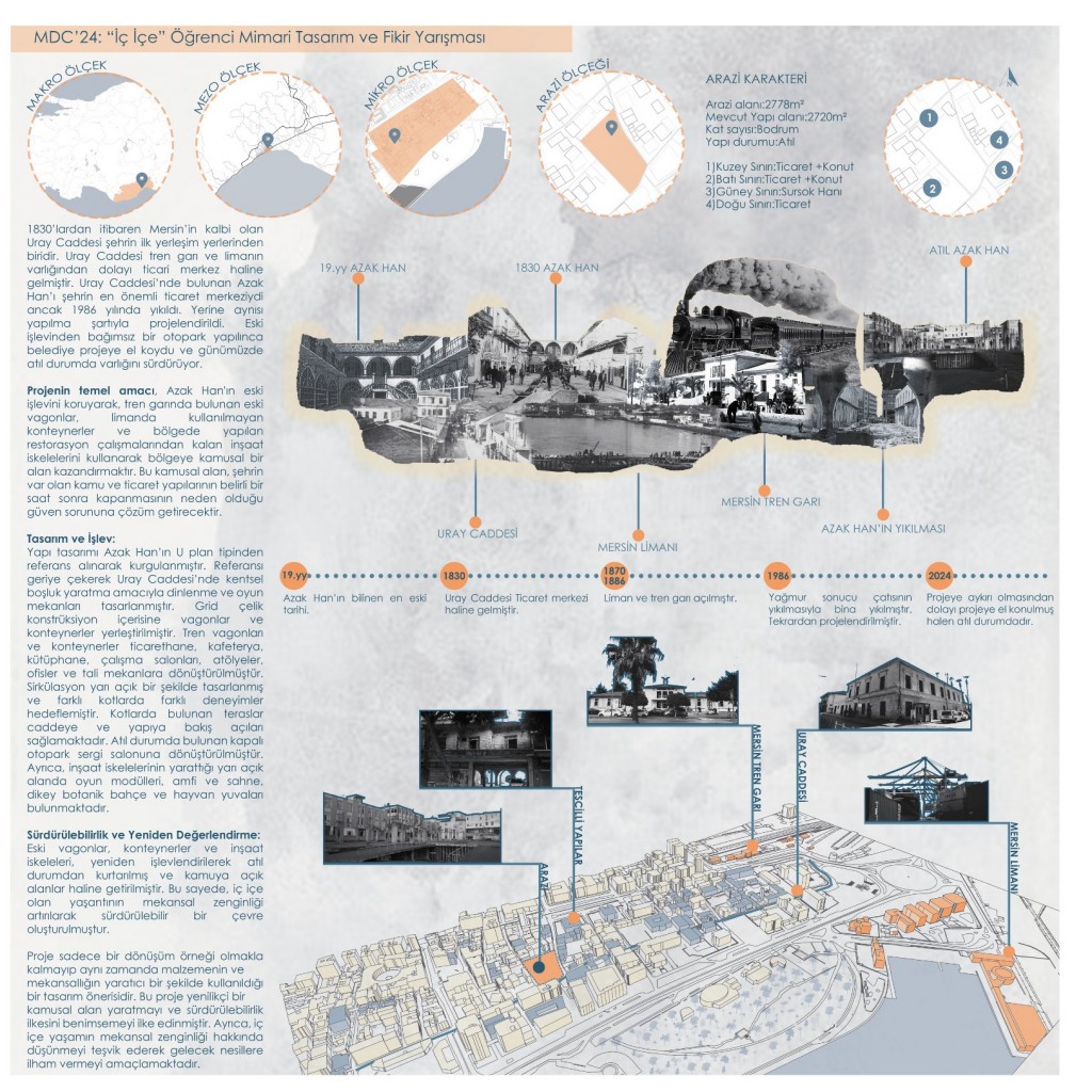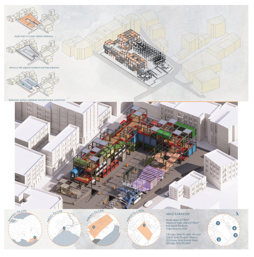 Yıldız Teknik Üniversitesi Yapı Kulübü tarafından düzenlenen ulusal ölçekli öğrenci yarışması çağrısının hedefi mevcut yapılı çevre içerisinde atıl kalmış alanların yeniden kazandırılmasına yönelik yaratıcı fikir tasarımlarının geliştirilmesidir. Bu kapsamda öğrencilerimizin 1980’lerde tarihi kent merkezinde yıkılan Azak Han'ın tasarımla yeniden kent hayatına kazandırılmasına yönelik geliştirdikleri mimari tasarım önerisi juri heyeti tarafından eşdeğer ödüle layık görülmüştür.