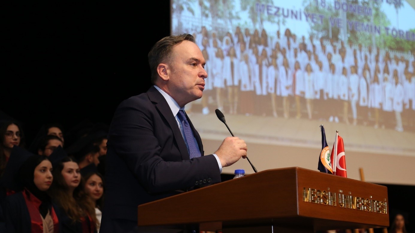 Mersin Eczacı Odası Genel Sekreteri Sayın Ecz. Oktay ASLAN, “Bugün edeceğiniz yemin sonrası meslektaşlarınız olarak aramıza katılacaksınız. Sizlerle özellikle staj döneminde ve 5. sınıf staj eğitimlerinizde ne yapacağınız ile ilgili çok fazla konuşmuştuk. Fakültemizin akreditasyon sürecine destek veriyoruz ve birlikte omuz omuza yürüyoruz. Kendilerine bu konuda her türlü desteğimizi sunuyoruz. Önümüzdeki süreçte de tekrar akreditasyon alacağımızdan şüpheniz yok. Bu kapsam da gerçekleştirmiş olduğumuz simülasyon eczanesini de en kısa sürede tekrar tamamlayacağız. Bunun sözünü de veriyoruz. Bizler oda olarak fakülteden mezun olan tüm meslektaşlarımıza yardım için uzun yıllardır çaba göstermekteyiz. Mersin’de kalan meslektaşlarımızla mezuniyetleriniz sonrası bayram dönüşü bir eğitim, bilgilendirme ve tanışma toplantısı yapacağız. Unutmayalım ki odalar, meslektaşlarımızın yani bizlerin gücü. Aramıza katılan siz değerli meslektaşlarımızla gücümüzü artırarak problemlerimizi hızlı çözebileceğimize inanıyor, meslek hayatınızda hepinize başarılar diliyorum” ifadelerini kullandı.