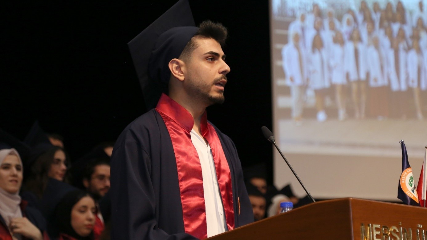 Beşinci sınıf temsilcisi Ecz. Mustafa BÜYÜKKAYA ise, “Şöyle geriye dönüp baktığımda zamanın nasıl çabuk geçtiğini görmek ve üniversite yıllarının sonuna gelmek beni biraz üzse de gelecek yıllarda bu kutsal mesleği yapacak olmanın gururunu yaşıyorum. Artık hepimiz mesleğimizi ileri taşıyacak eczacılarız. Hepimizin mesleğini en güzel şekilde icra edeceğinden hiçbir şüphem yok. Bütün eczacı arkadaşlarıma meslek hayatlarında başarılar diliyorum. Deneyim, tecrübe ve bilgilerini bize aktarıp iyi bir eczacı olarak mezun olmamızı sağlayan bütün hocalarıma emekleri için teşekkür ediyorum. Tüm okul hayatımızda bizlere destek olan başta benim annem olmak üzere salondaki tüm annelerimize, bu önemli günde bizleri yalnız bırakmayan tüm misafirlerimizle birlikte yanımda olan abime, teyzeme ve kız arkadaşıma teşekkürlerimi sunuyorum.” ifadelerini kullandı.