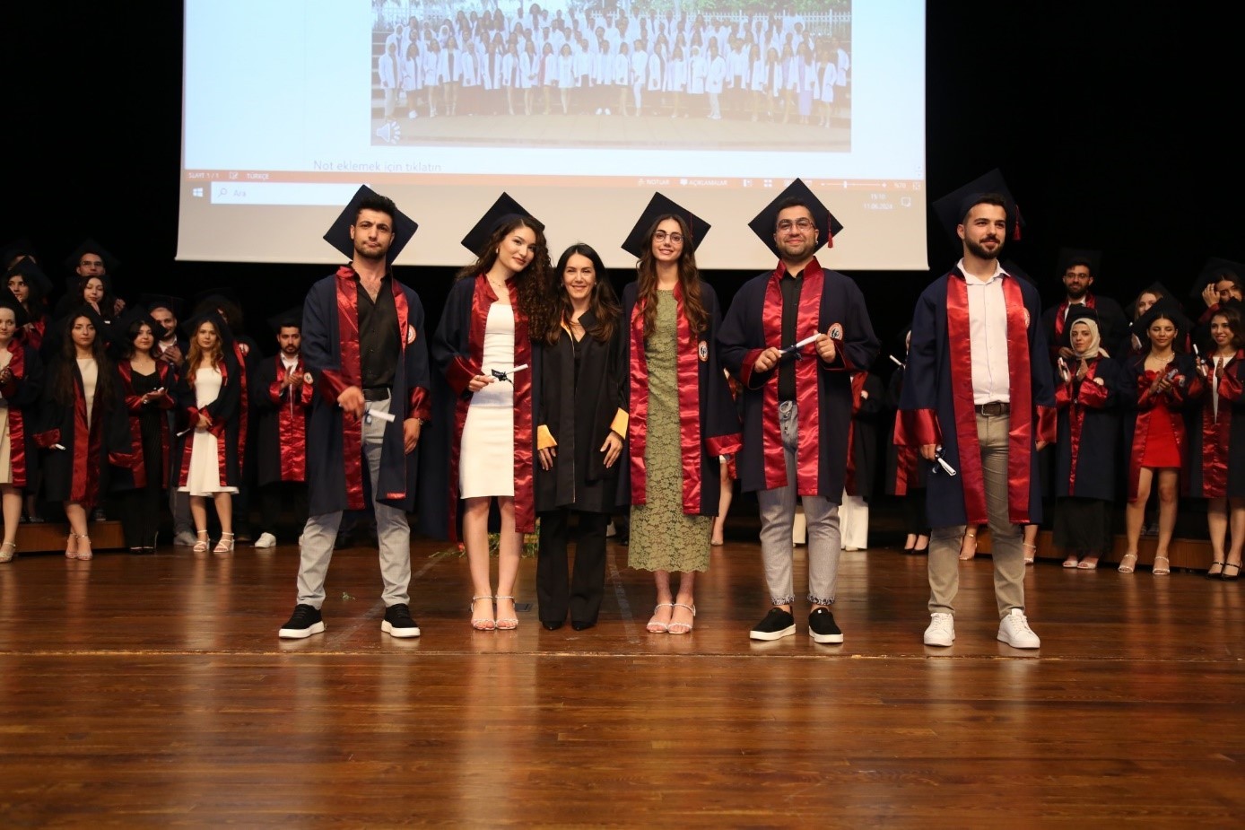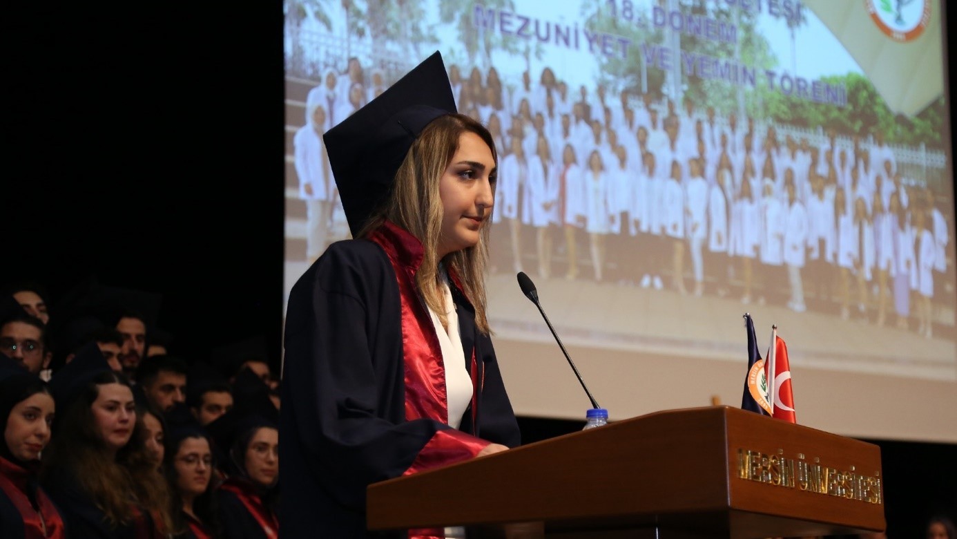 2023-2024 Eğitim Öğretim Yılı dönem birincisi Ecz. Burçin DÜŞKÜN, “Beş yıl önce hepimiz zorlu sınavlar sonucunda Eczacılık Fakültesi’ne gelmeye hak kazandık. Bugün ise hepimiz için bu uzun ve meşakkatli bir yolculuğun sonundayız. Ancak, bu yolculuk boyunca karşılaştığımız zorluklar ve başarılar, bizi daha da güçlü kıldı ve bu anın daha da değerli olmasını sağladı. Bugün, fakülte birincisi olmanın gururunu yaşıyorum. Ancak, bu başarı sadece bana ait değil. Arkamızda bizi destekleyen birçok kişi var. Ailelerimiz, arkadaşlarımız, öğretmenlerimiz ve akademik danışmanlarımız bize destek oldular ve bizi cesaretlendirdiler. Onlara minnettarız ve bu başarıyı onlarla paylaşıyoruz. Gelecekte, bu başarıyı sürdürmek ve eczacılık alanında daha da ileri gitmek için elimizden gelenin en iyisini yapacağız. Sağlık sistemimizin bir parçası olarak, toplumumuza hizmet etmek ve insanların yaşam kalitesini artırmak için çalışacağız.” şeklinde konuştu.