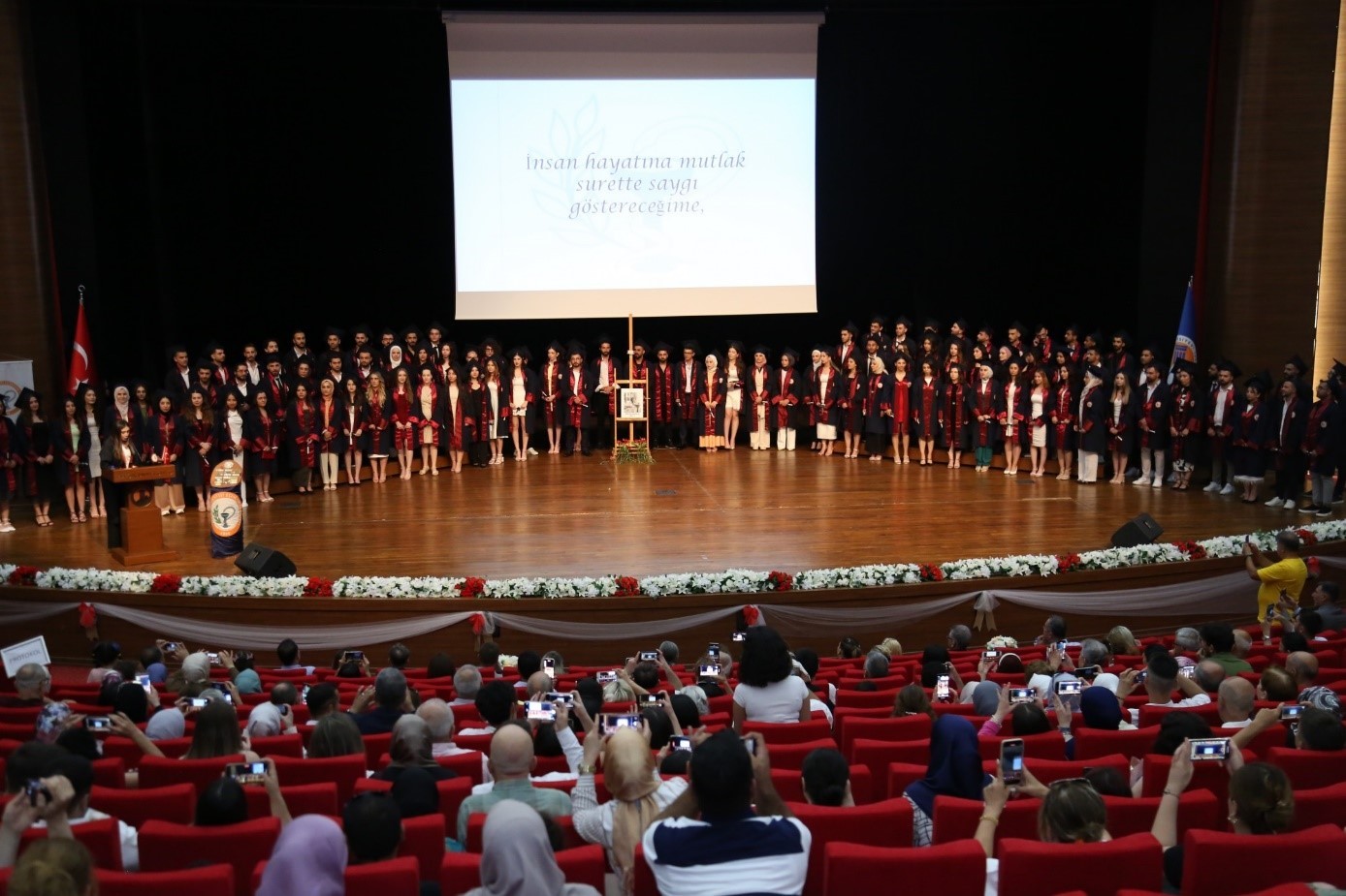 Konuşmasını mezunlarımıza seslenerek sonlandıran Prof. Dr. Ahmet Hakan ÖZTÜRK, “Her zaman, bugünkü gibi yüzünüzdeki gülümsemeyi eksiltmeyin. Her zaman hastalarınıza güler yüzlü şekilde sempati ve empatiyle yaklaşın, sağlıklı bir iletişim kurun. Hastanın tedavisine sevgiyle ve saygıyla başlanıyor. Yüzünüzdeki gülümseme ve içinizdeki insan sevgisi hiçbir zaman eksik olmasın. Hepinizin yolu ve bahtı açık olsun.” şeklinde konuştu.