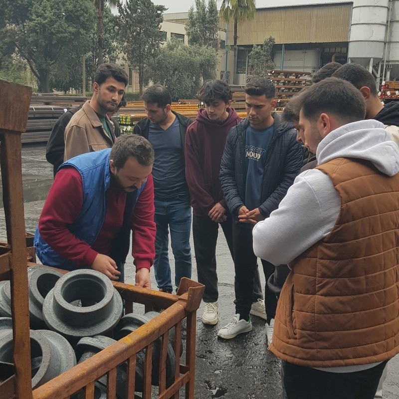 Teknik Bilimler Meslek Yüksekokulu Makine ve Metal Teknolojileri Bölümü Öğretim Görevlisi Mert Son ve makine programı öğrencileri tarafından 22 kasım 2024 tarihinde, Çukurova Holding’e bağlı Mersinde kurulu bir sanayi şirketi olan, inşaat makinaları ve çeşitli marka ve modelde inşaat makinalarının yürüyüş takımları , kazıcı ve delici uçları vb. yedeklerinin üretimini gerçekleştiren Çukurova İnşaat Makinaları Sanayi ve Ticaret A.Ş. (ÇİMSATAŞ) firmasına teknik gezi düzenlenmiştir. Teknik gezi sırasında öğrencilerimize ilgili bölüm mühendisleri tarafından, firmada gerçekleştirilen sıcak dövme, çelik döküm, talaşlı imalat süreçleri ve üretilen parçalar hakkında bilgilendirmeler yapılmıştır. Teknik gezinin düzenlenmesine imkân sağlayan ÇİMSATAŞ İnsan Kaynakları ve Eğitim Şefi Özdeş Akkaya’ya teşekkür ederiz.