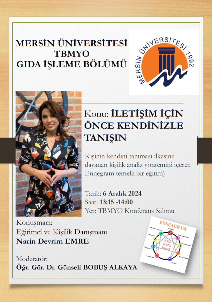 Gıda İşleme Bölümü İletişim dersi kapsamında "İletişim İçin Önce Kendinizle Tanışın" başlıklı eğitim semineri gerçekleştirildi. Eğitimci ve kişilik danışmanı olan Narin Devrim EMRE tarafından verilen eğitime geniş bir katılım sağlandı. "İnsanların doğasında taşıdığı benzersiz mizacın, kişisel gelişim ve potansiyel kabiliyetin keşfi için eğitimin gereğine olan inancımı paylaşıyorum. Her birimizin içsel kaynaklarını daha etkin bir şekilde kullanarak daha anlamlı ve doyurucu bir yaşam sürme potansiyeli olduğuna inanıyorum" diyen Sayın Devrim bu karmaşık konuyu anlamlandırarak ve sadeleştirerek bizlere etkili bir sunum gerçekleştirdi. Tüm bölüm hocalarının destek ve katkıları ile Dr. Öğr. Üyesi Ayşin Güzel Değer, Ögr. Gör. Dr. Günseli Bobuş Alkaya, Öğr. Gör. Merve Çarıkçıoğlu ve Öğr. Gör. Tuğba Gürses'in katılımları ile gerçekleştirildi. Sunum sonunda Sayın Devrime katkılarından dolayı teşekkür belgesi ve çiçek takdim edildi.