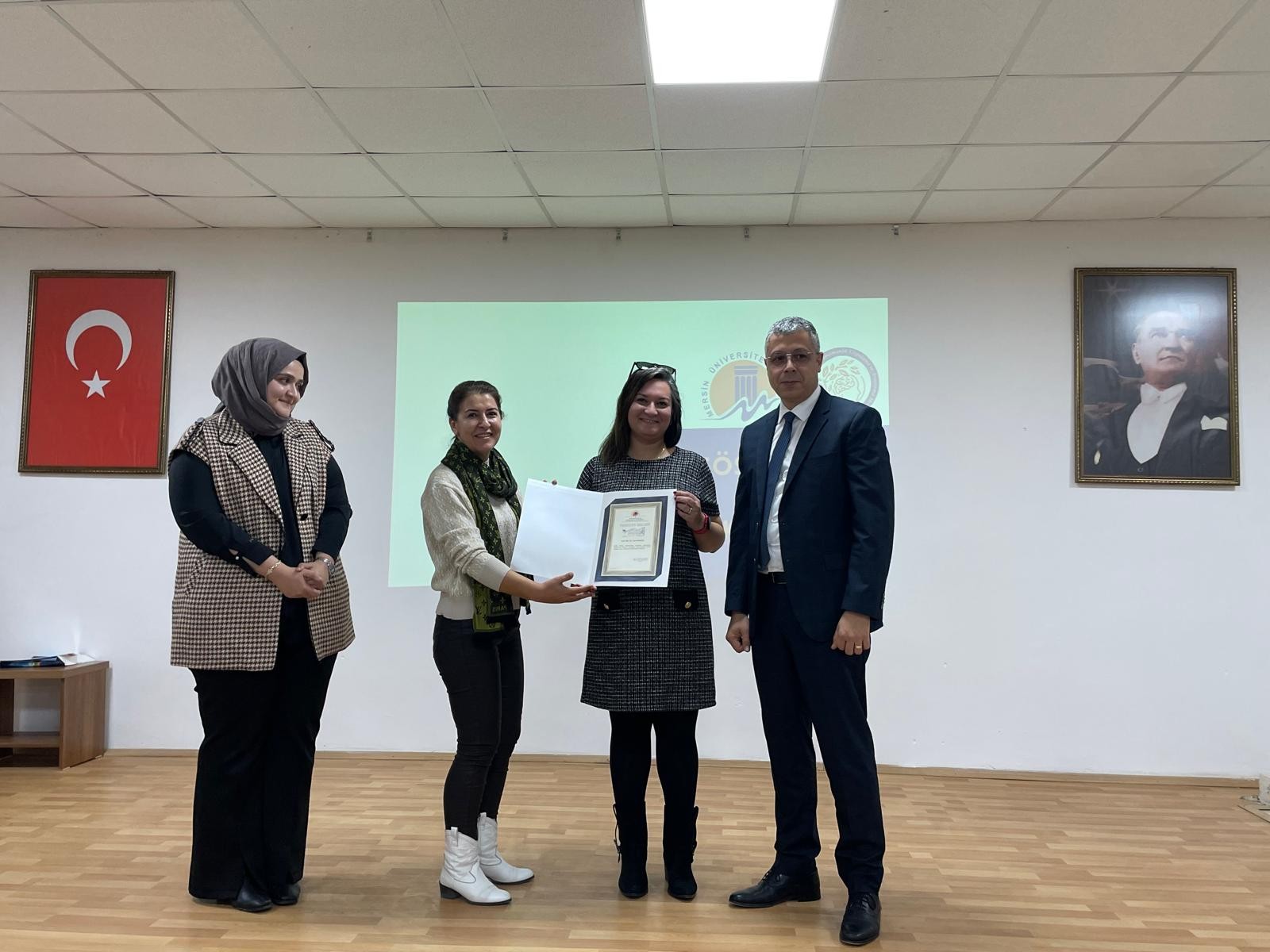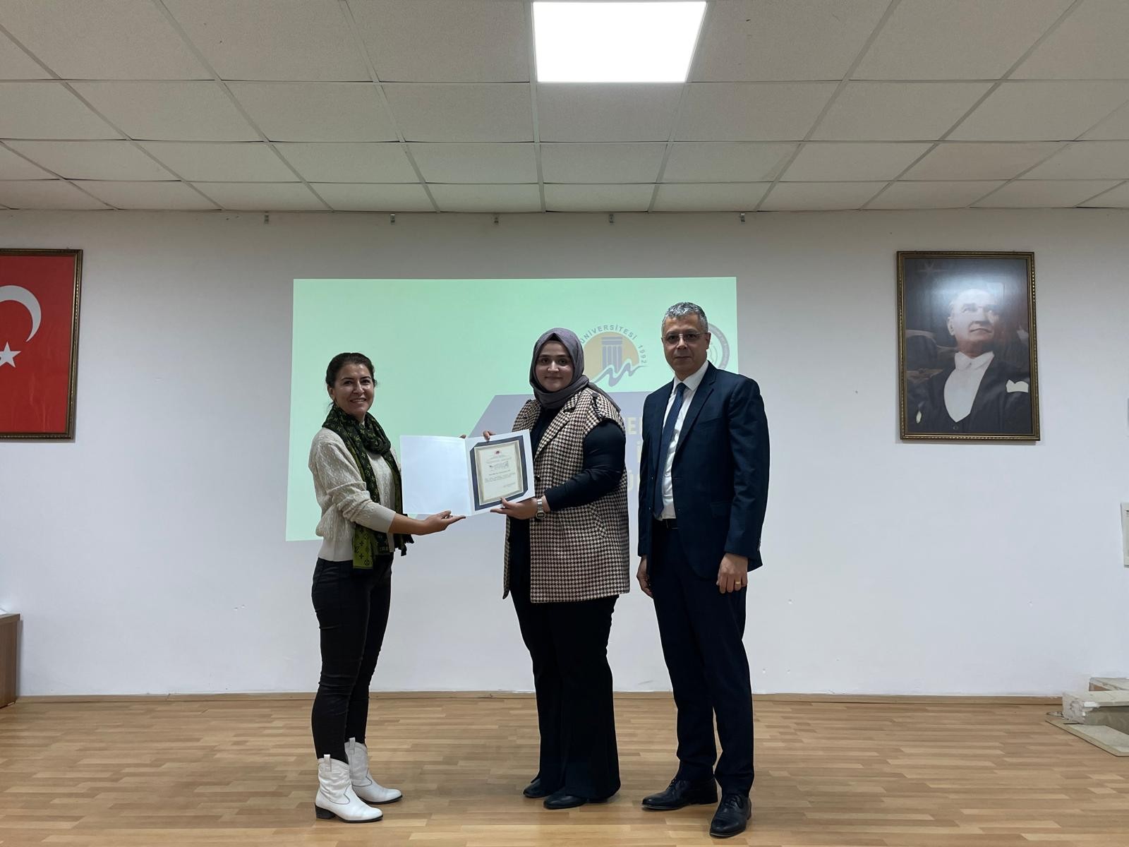 Etkinlik sonunda, Yüksekokul Müdürümüz Doç. Dr. Muhammet Saygın ve  Müdür Yardımcısı Öğr. Gör. Fatma Yeşil tarafından katılımcılara teşekkür belgeleri takdim edildi.