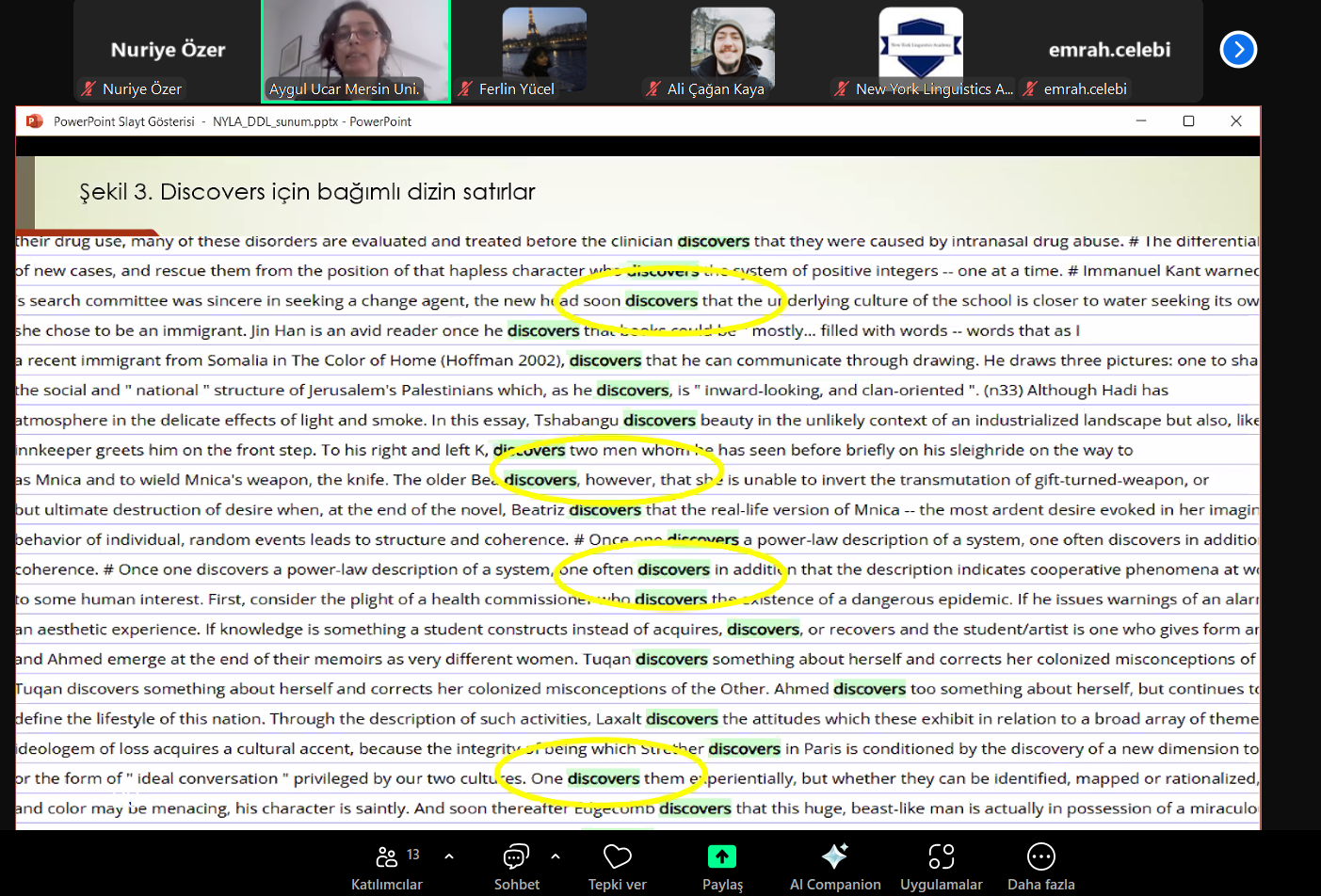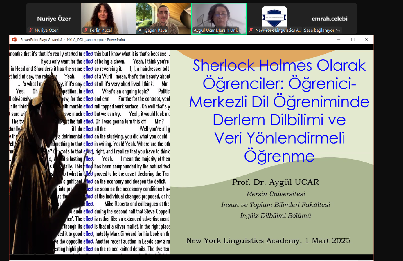 Bölüm öğretim üyemiz Prof. Dr. Aygül Uçar tarafından New York Linguistics Academy Dil Okulu Webinar etkinlikleri kapsamında 1 Mart 2025 tarihinde "Sherlock Holmes Olarak Öğrenciler: Öğrenici-Merkezli Dil Öğreniminde Derlem Dilbilimi ve Veri Yönlendirmeli Öğrenme" başlıklı bir sunum yapıldı. Sunumda, ilk olarak derlemler ve derlem dilbilimi hakkında bilgi verildi. Sunumda ayrıca derlemden elde edilen bağımlı dizin satırları ile dil kullanımları ve örüntülerinden yola çıkarak öğrencilerin aktif dil öğrenme süreçlerinin nasıl destekleneceği örnekler ile açıklandı.