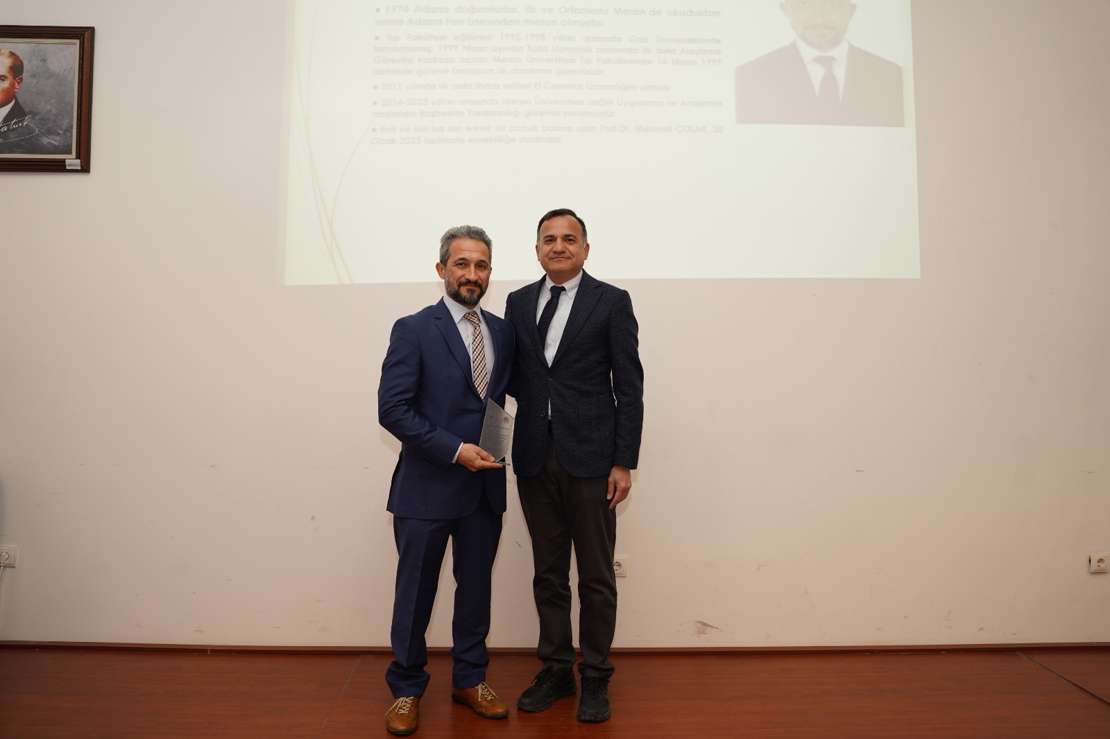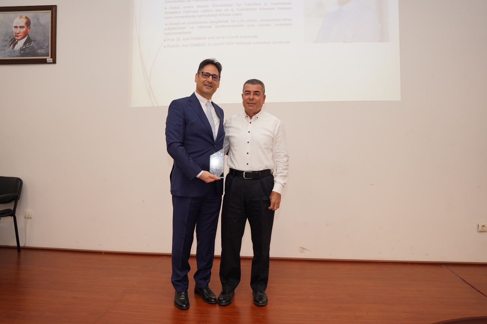 Konuşmalar sonrasında plaket takdimine geçildi. Prof. Dr. Anıl Tombak’a Dekanımız Prof. Dr. Ali Kaya, Prof. Dr. Enver Reyhan’a Mersin Üniversitesi Hastanesi Başhekimi Prof. Dr. Yusuf Usta, Prof. Dr. Mehmet Çolak’a Dekan Yardımcımız Prof. Dr. Şükrü Hakan Kaleağası, Prof. Dr. Arzu Kanık’a ise Dekan Yardımcımız Prof. Dr. Serap Demir tarafından plaketleri takdim edildi.