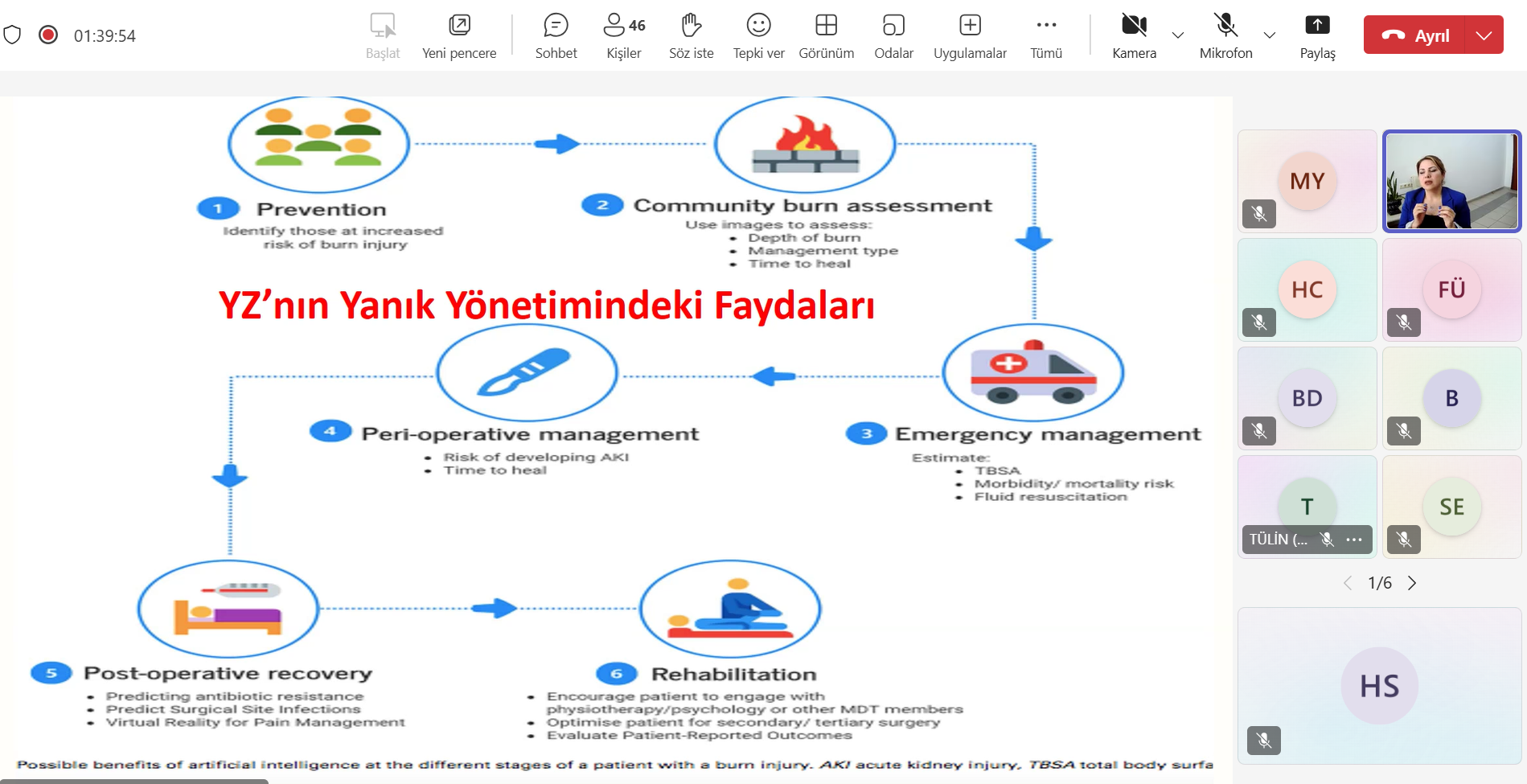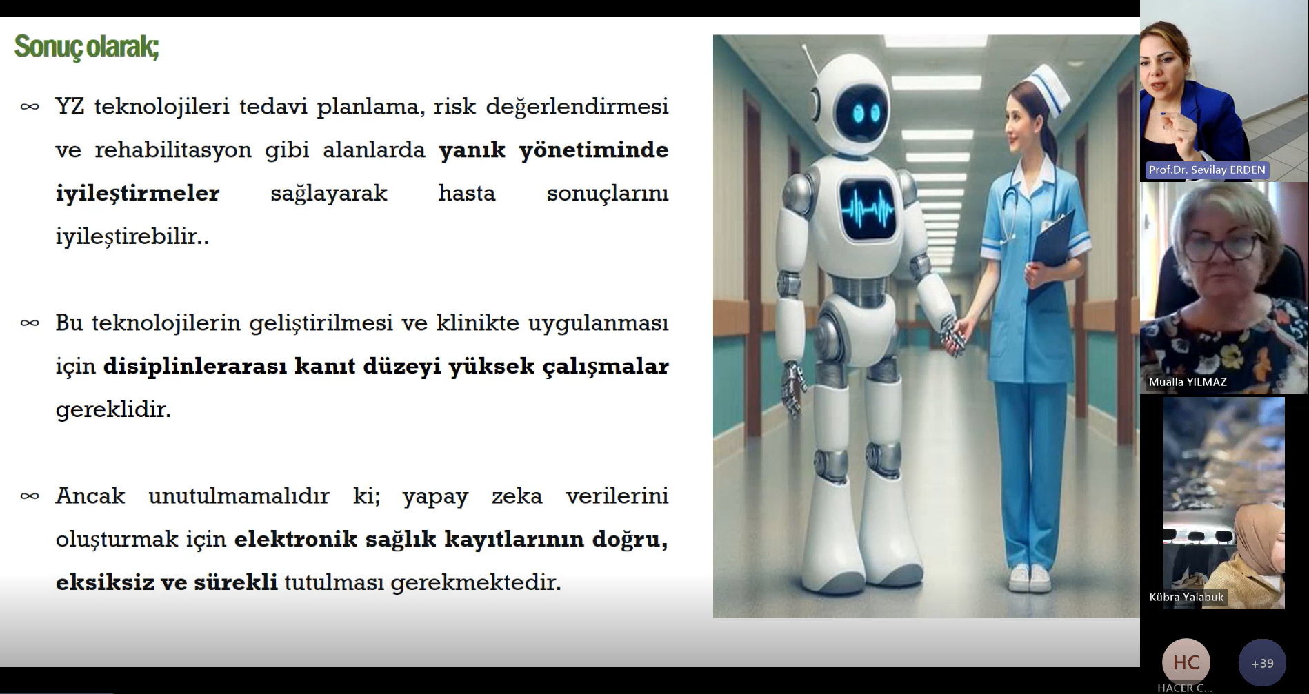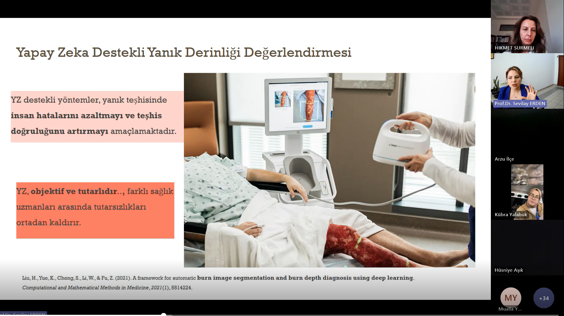 Çukurova Üniversitesi Sağlık Bilimleri Fakültesi Hemşirelik Bölümü öğretim üyesi Prof. Dr. Sevilay ERDEN’in sunumuyla gerçekleşen webinarda, yapay zeka destekli yanık değerlendirme yöntemleri, tedavi planlaması, risk analizleri ve rehabilitasyon süreçlerindeki kullanım alanları ele alındı. Ayrıca, yapay zekanın hemşirelik uygulamalarındaki potansiyeli vurgulanarak, katılımcılara güncel gelişmeler hakkında bilgi verildi.