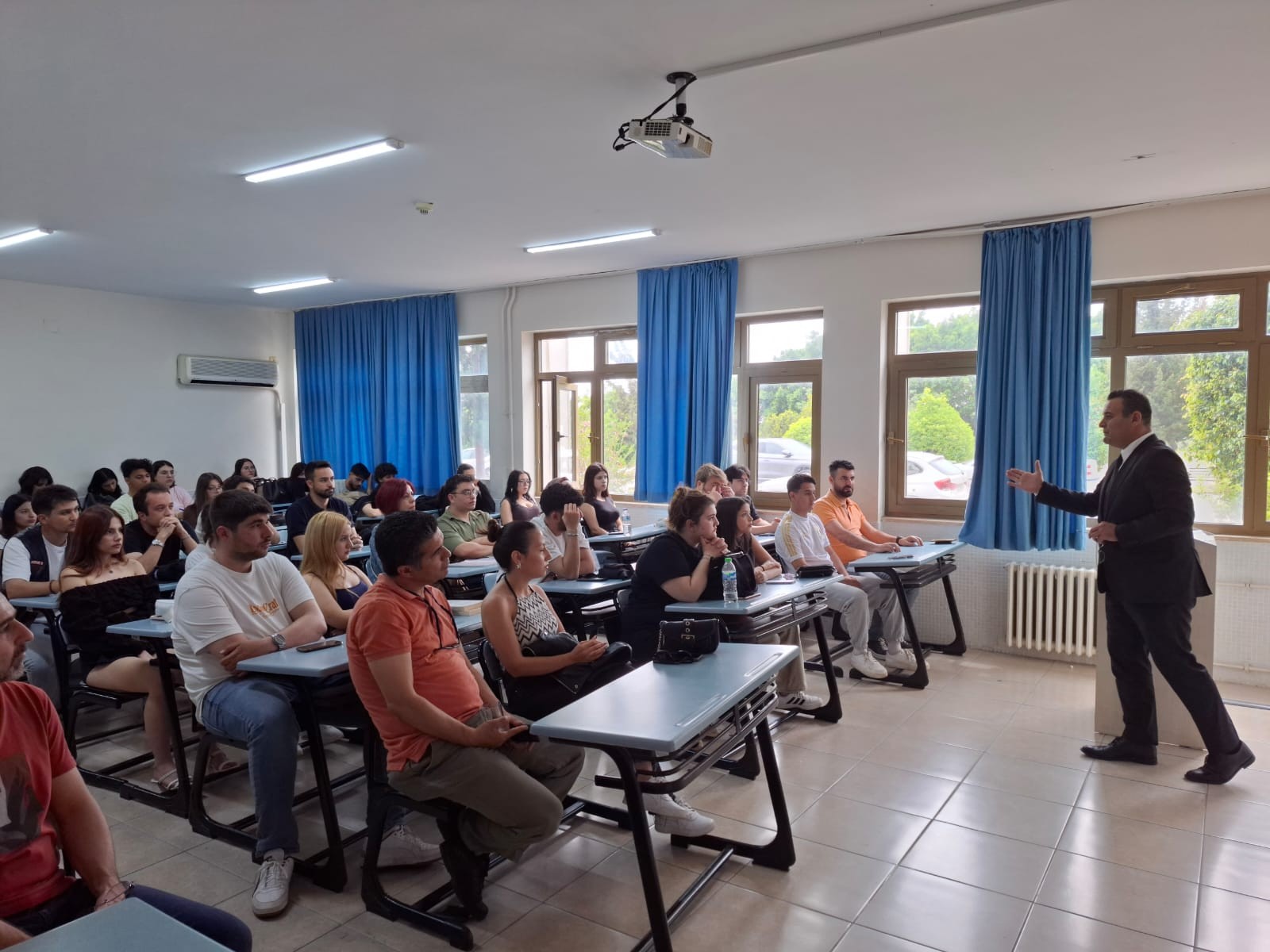 15-22 Nisan Turizm Haftası kapsamında düzenlenen seminerlerin ikincisi, 24 Nisan 2025 tarihinde Sosyal Bilimler Meslek Yüksekokulu Turizm ve Otel İşletmeciliği Programı ev sahipliğinde gerçekleşti. Seminere konuk olarak katılan Divan Otel FMB Müdürü Onur Öz, “Konaklama İşletmelerinde F&B Departmanı’nda Sorun Çözme” başlıklı sunumuyla öğrencilere sektör deneyimlerini aktardı. Öğrencilerin yoğun ilgi gösterdiği etkinlikte, Onur Öz, konaklama sektöründe karşılaşılan güncel problemler ve bu problemlere yönelik çözüm yöntemleri üzerine bilgiler paylaştı. Etkileşimli geçen sunumda öğrenciler, merak ettikleri soruları doğrudan Onur Öz’e yöneltme fırsatı buldu.