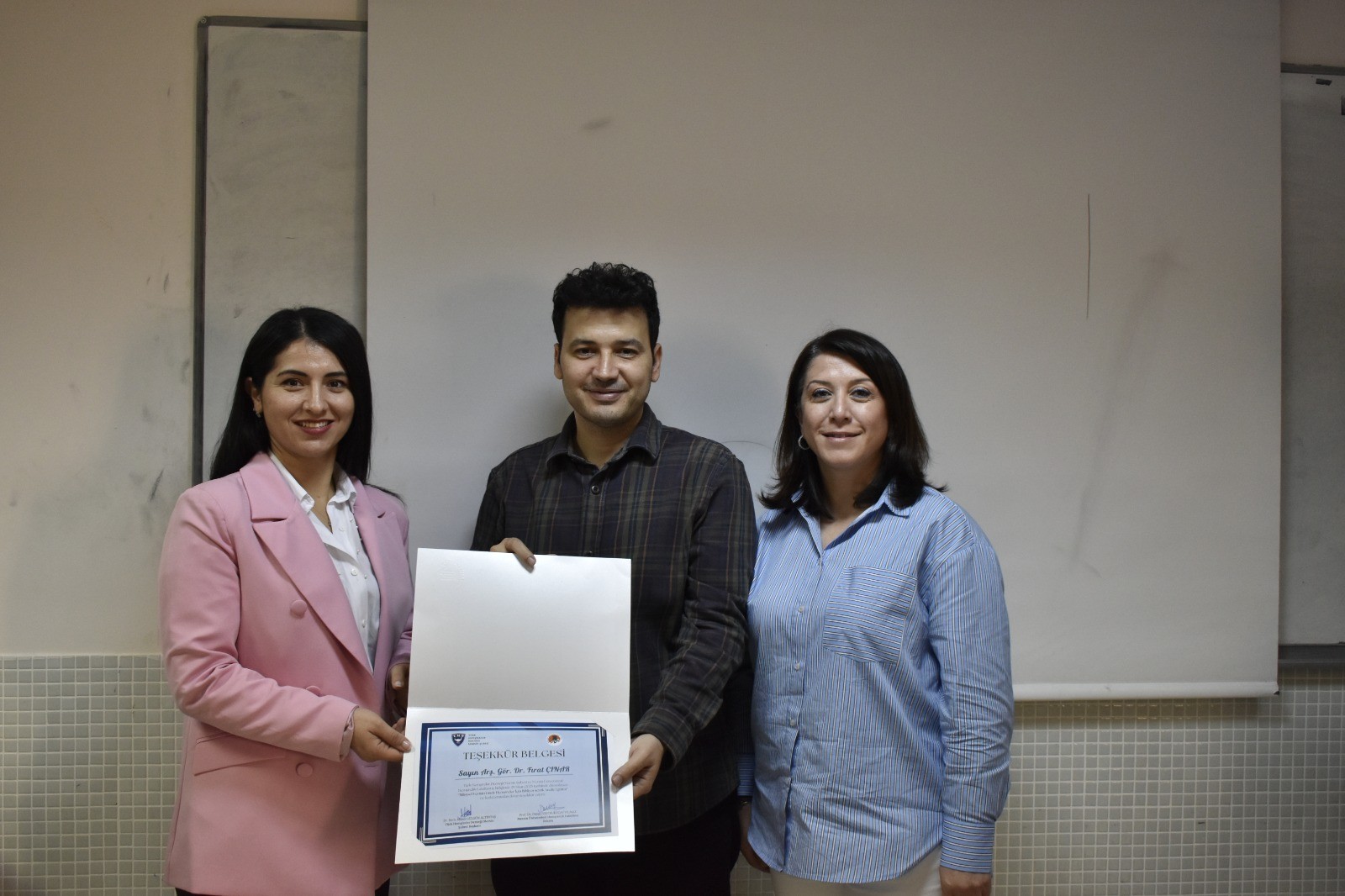 Eğitim Arş. Gör. Dr. Fırat ÇINAR’a Hemşirelik Fakültesi Dekanı Prof. Dr. Duygu VEFİKULUÇAY YILMAZ ve THD Mersin Şubesi Başkanı Dr. Hem. Melek Gülgün Altıntaş tarafından takdim edilen Teşekkür Belgesinin takdimi ve katılımcılara katılım belgelerinin verilmesi ile sona ermiştir.