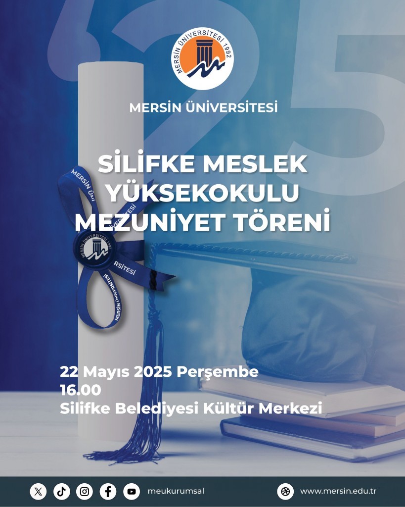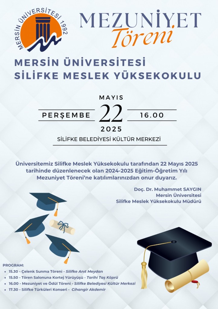 Mersin Üniversitesi Silifke Meslek Yüksekokulu 2024–2025 Eğitim-Öğretim Yılı Mezuniyet Töreni, aşağıda belirtilen tarih, saat ve mekânda gerçekleştirilecektir.