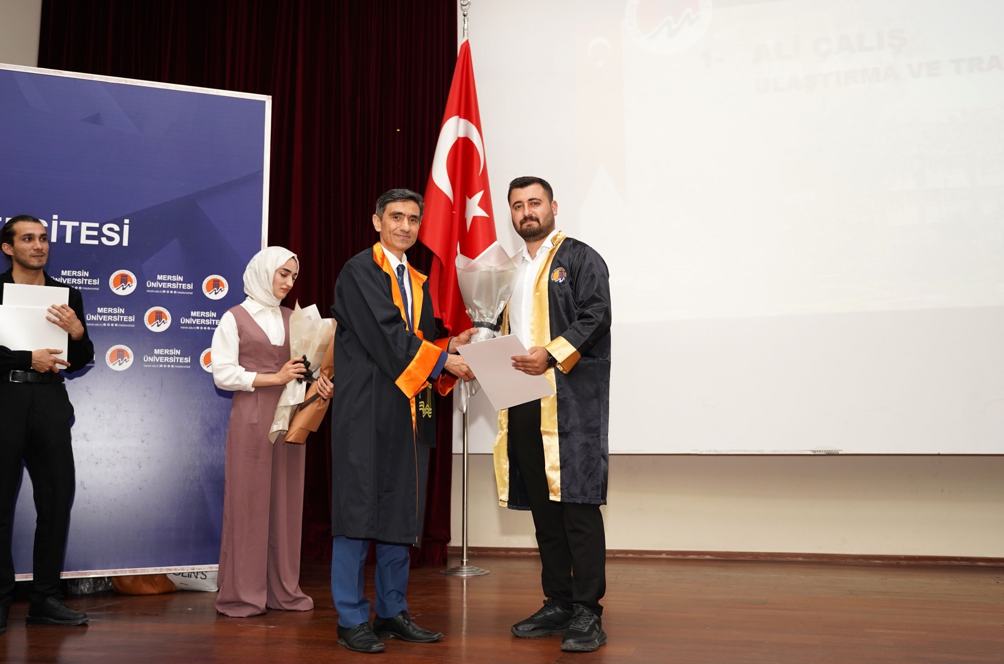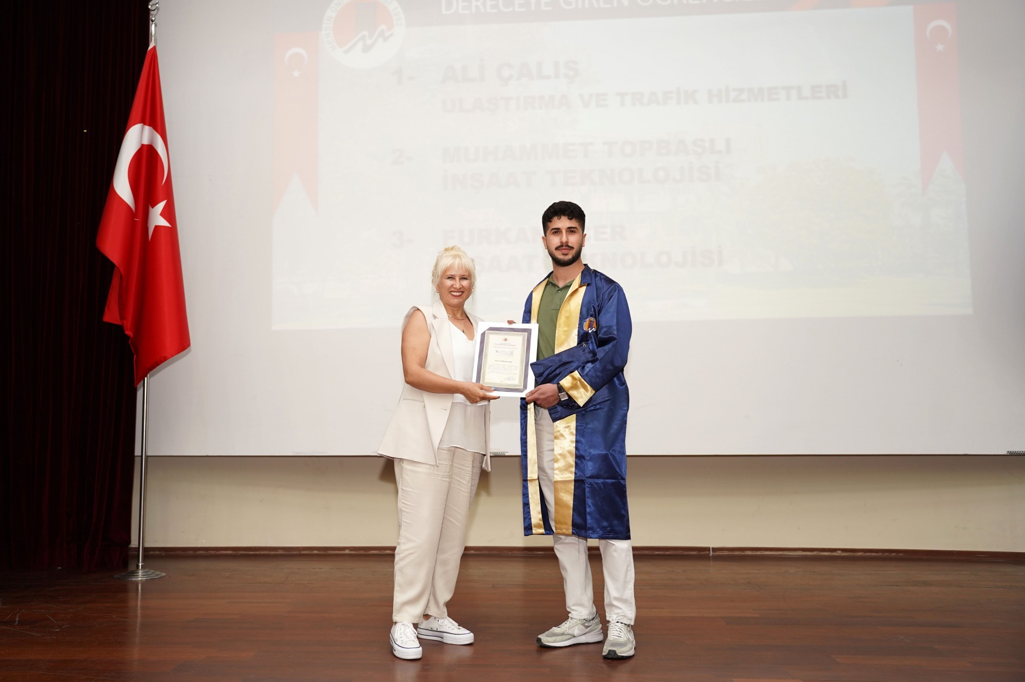 Meslek Yüksekokulu birincisi Ulaştırma Hizmetleri Bölümü, Ulaştırma ve Trafik Hizmetleri Programı öğrencisi Ali Çalış, mezun öğrencilerimiz adına gerçekleştirdiği konuşmada, geleceğe şekil verecek meslek sahibi bireyler olarak mezun olmanın mutluluğunu yaşadıklarını söyledi. Ali Çalış, hedeflerine doğru ilerlerken her zaman yanlarında olan aileler ve akademisyenlerimize teşekkürlerini iletti.
