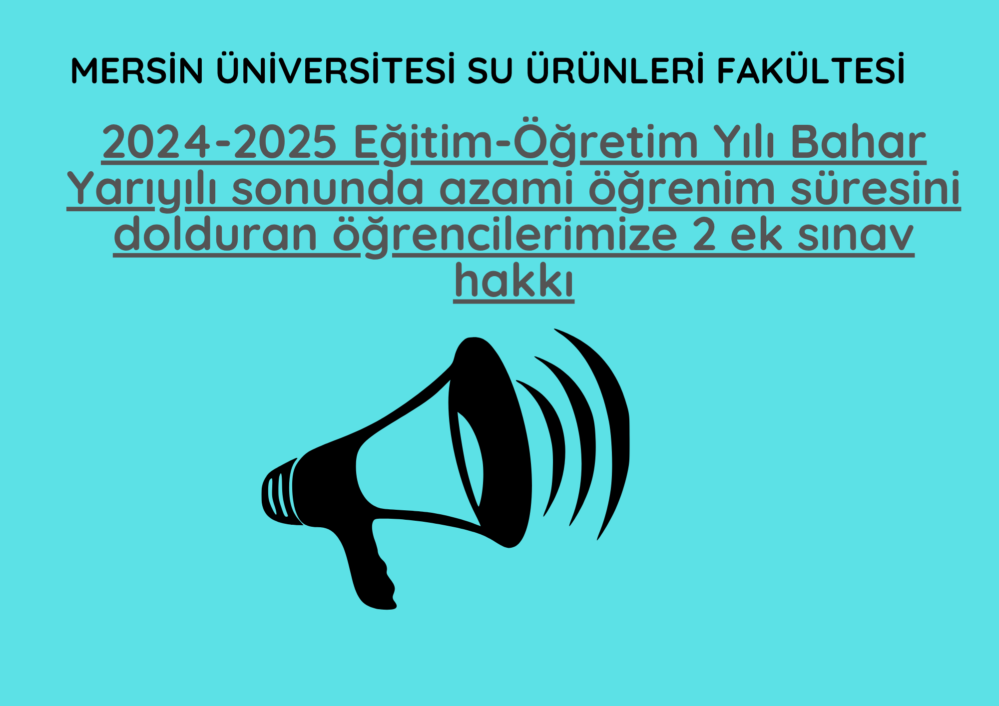 2024-2025 Eğitim-Öğretim Yılı Bahar Yarıyılı sonunda azami öğrenim süresini dolduran öğrencilerimize 2 ek sınav hakkı tanınmıştır.