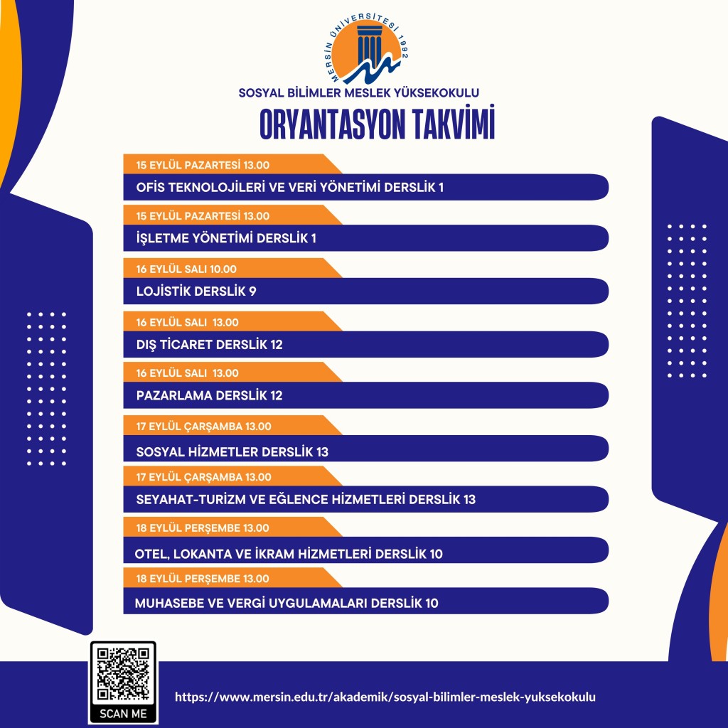 Yeni kayıt olan öğrencilerimize yönelik Oryantasyon Eğitimi, belirtilen gün ve saatlerde ilgili dersliklerde gerçekleştirilecektir. Tüm öğrencilerimizin eğitimlere katılımı önemle rica olunur.