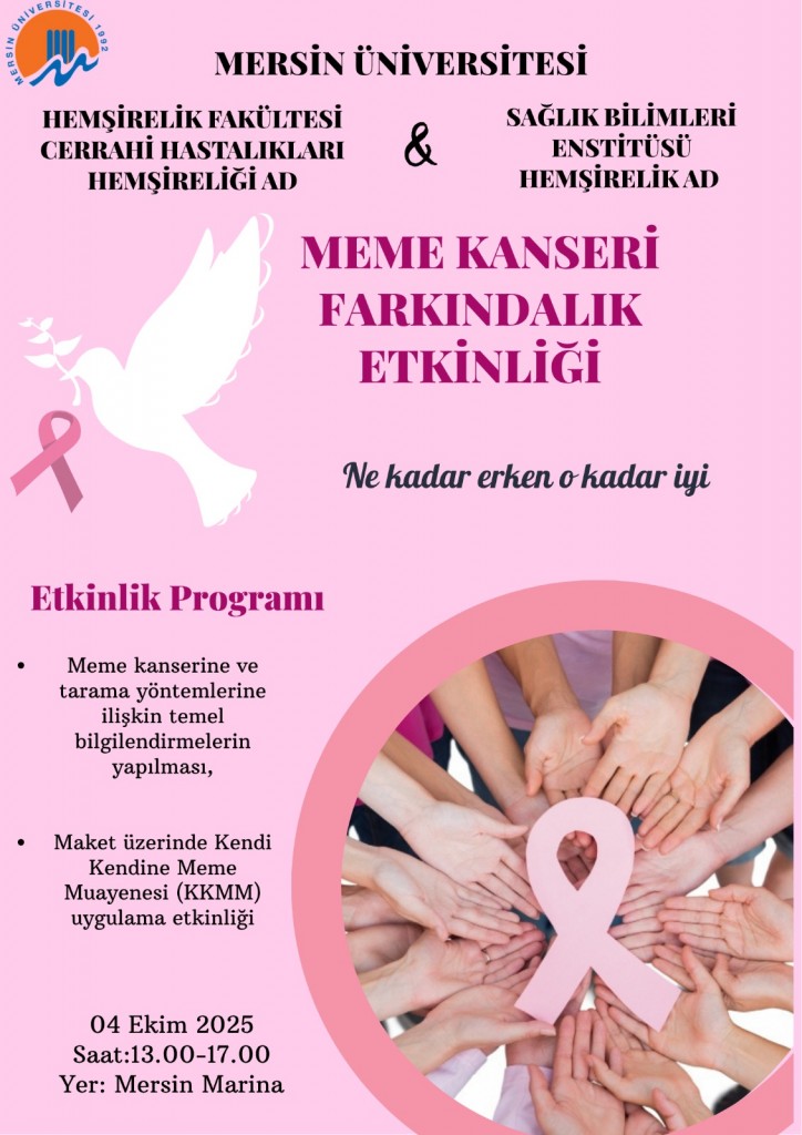 Hemşirelik Fakültesi Cerrahi Hastalıkları Hemşireliği Anabilim Dalı ve Sağlık Bilimleri Enstitüsü Hemşirelik Anabilim Dalının birlikte organize ettiği Meme Kanseri Farkındalık Etkinliği 4 Ekim 2025 Tarihi Saat 13:00 -17:00 arasında Mersin Marina'da Gerçekleştirilecektir.