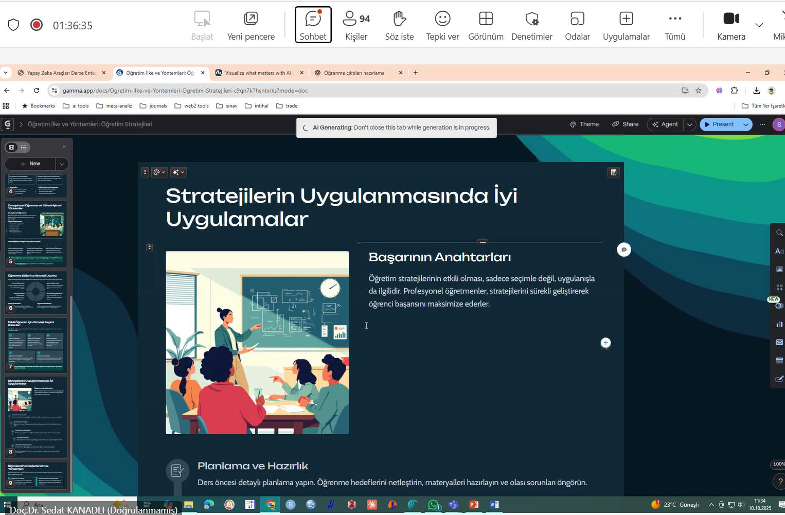 Etkinlikte, yapay zekâ teknolojilerinin eğitim alanındaki kullanımına odaklanılarak, öğrenme ve öğretme süreçlerinin farklı aşamalarında uygulanabilecek yapay zekâ araçları uygulamalı biçimde tanıtıldı. Katılımcılara, öğretim planı hazırlama, ölçme-değerlendirme, sunum, görsel, video, oyun, simülasyon ve bilgi kartı oluşturma gibi öğretim süreçlerinde kullanılabilecek istem (prompt) uygulamaları hakkında örnekler sunuldu.