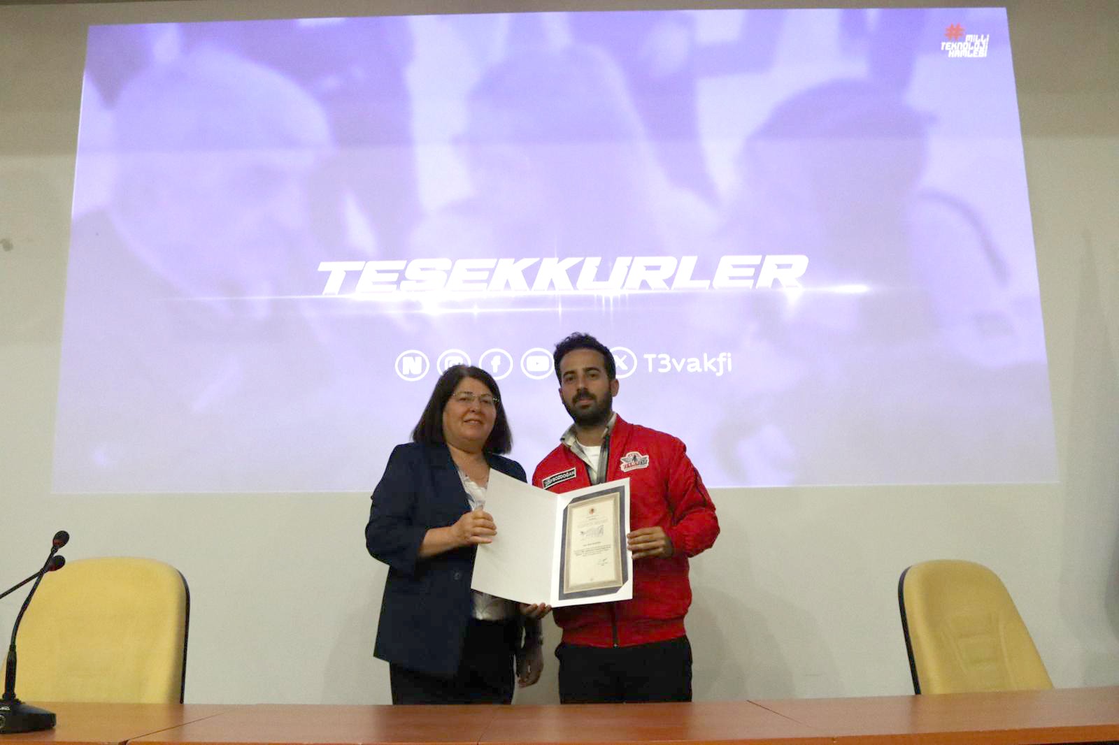 Öğrencilere burs programına başvuru süreçleri, sağlanan imkanlar ve T3 Vakfı ekosisteminde yer almanın sunduğu fırsatların aktarıldığı sunumda öğrencilerin sorularına yanıt verildi. Ardından Rektör Danışmanımız Prof. Dr. Ayla Özer tarafından Ahmet Bozdoğan’a teşekkür belgesi takdim edildi.