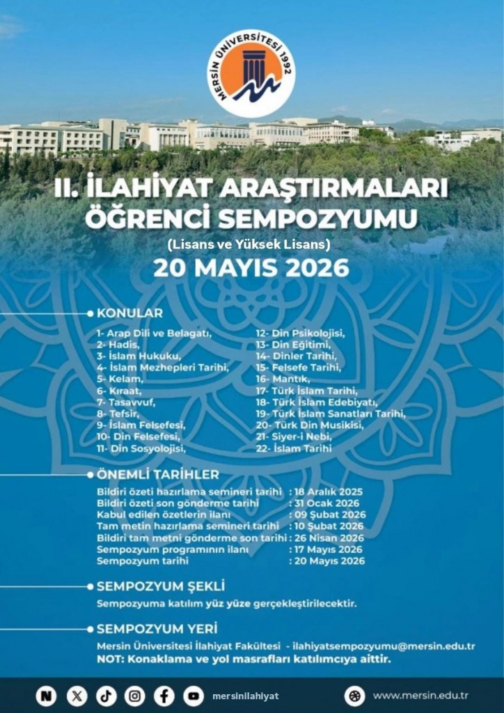 Bildirilerin özetlerinin 31 Ocak 2026 ve tam metinlerinin de 26 Nisan 2026 tarihlerine kadar ilahiyatsempozyumu@mersin.edu.tr e-posta adresine gönderilmiş olmaları zorunludur.