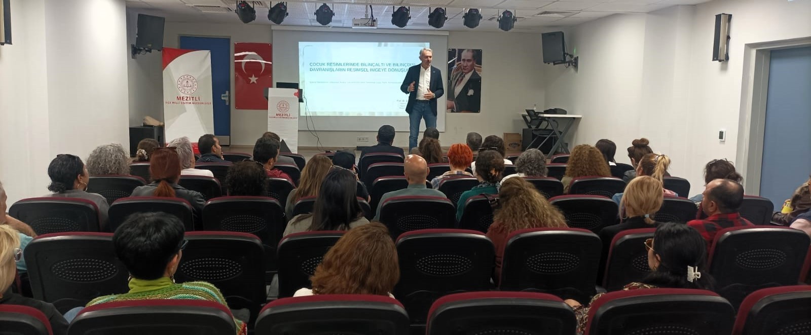 3 Aralık Çarşamba günü Prof. Dr. Emrah Uysal tarafından gerçekleştirilen “Çocuğun Sanatsal Gelişimi” konulu söyleşi, Şehit Özkan Demir Ortaokulu Konferans Salonu’nda, Mezitli İlçe Millî Eğitim Şube Müdürü Çetin Çınğı ile Mezitli İlçe Millî Eğitim Müdürlüğüne bağlı okullarda görev yapan görsel sanatlar öğretmenleri ve rehber öğretmenlerin katılımıyla gerçekleştirildi.