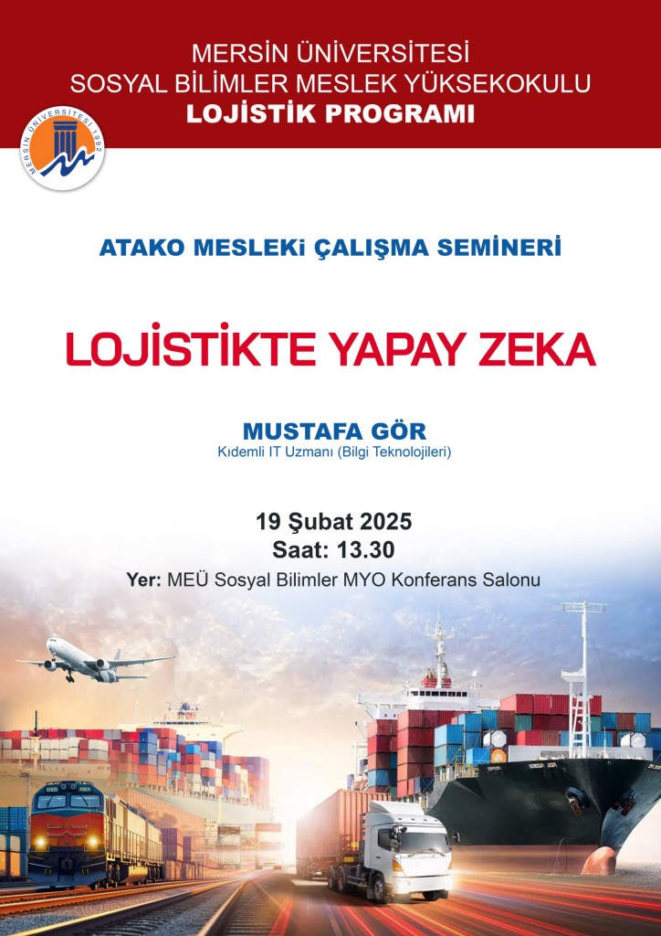 Mersin Üniversitesi Sosyal Bilimler Meslek Yüksekokulu Lojistik Programı tarafından düzenlenen ATAKO Mesleki Çalışma Semineri kapsamında gerçekleştirilen etkinlik, Lojistik Programı Öğr. Gör. Erdem Daşçı’nın koordinasyonunda yürütüldü. Program çerçevesinde Kıdemli IT Uzmanı Mustafa Gör öğrencilerle bir araya gelerek lojistik sektöründe yapay zekâ uygulamalarına ilişkin güncel gelişmeleri paylaştı.